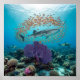 Esta impresionante fotografía submarina capta la majestuosa presencia de un tiburón ballena, nadando suavemente en medio de una densa escuela de peces más pequeños. Debajo, florece un arrecife de coral vibrante con una variedad de corales duros y blandos de color, incluido un coral de ventilador púrpura prominente. Se puede ver a dos tiburones de arrecife más pequeños patrullando en el fondo, lo que se suma a la vida dinámica de este vibrante ecosistema marino. El agua azul clara y luminosa pone de relieve la increíble biodiversidad y la coexistencia pacífica en esta impresionante escena oceánica.