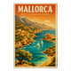 Travel poster featuring Mallorca, Spain, in a classic retro travel-poster style. Central focus on the dramatic Serra de Tramuntana mountains overlooking turquoise Mediterranean coves, with golden sandstone villages, olive groves, and winding coastal roads along the cliffs. A historic cathedral silhouette rises near the shoreline while sailboats glide across crystal-clear waters under warm island sunlight. Rich Mediterranean color palette of deep turquoise sea, sunlit stone beige, olive green, and glowing sunset gold. Clean graphic illustration with subtle vintage grain texture. Bold vintage typography headline: “MALLORCA – GEM OF THE BALEARIC ISLANDS”. Vertical 2:3 layout, high-resolution, print-ready.