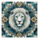 Esta es una impresionante pieza de arte que muestra la cara de un león estilizado en su centro. La forma del león forma un diseño mandala, con líneas blancas y grises que fluyen creando un sentido de movimiento y textura. Alrededor de la cara hay patrones intrincados que se deslizan hacia el exterior, incluyendo formas florales y geométricas en tonos azules, verde azulados y beige. Estos elementos contribuyen a una sensación de profundidad y simetría. El fondo es un verde azulado profundo, salpicado de pequeñas motas estrelladas, que le dan a la pieza un ambiente celeste y místico. El trabajo de arte combina temas naturales y fantásticos de manera transparente, creando una composición visualmente cautivadora.