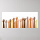 Ilustracion de un grupo de manos diversas de diferentes culturas y nacionalidades criadas en el aire. Diseño conceptual que muestra a la gente reuniéndose y dándose ayuda y apoyo mutuos. Imagen disponible en varios regalos y productos.