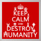 El diseño dice 'Mantener la calma y destruir la humanidad'. Hay muchas pequeñas siluetas de robots en las cartas. Es un diseño lindo y divertido, perfecto para cualquiera que ame robots y computadoras. O que simplemente odia a la humanidad. Puede cambiar el color de fondo muy fácilmente, sólo pulse personalizar. O, si quieres ver el diseño en un producto diferente, o quieres cambios, ponte en contacto conmigo a través de mi tienda, y haré lo que pueda. Gracias por buscar.