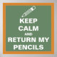 ¿Piden sus estudiantes que tomen prestado lápices y luego nunca los devuelvan? Recuerde a sus alumnos que devuelvan sus lápices colocando a este poster en su aula. Este poster muestra una foto de un pizarrón con el texto "MANTENER CALMA Y DEVOLVER MIS PENCILES" en una letra blanca.