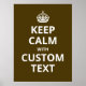 Haz tu propio y único "Keep Calm" y "Carry On" con nuestra plantilla de poster fácil de usar. Pulse 'personalizar' para editar el texto en cualquier frase que desee. Puntee en "personalizar más adelante" para ajustar la corona y el color del tipo de letra.
