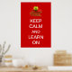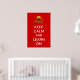 Este poster presenta un fondo rojo, con una imagen de una manzana verde en tres libros rojos, y un texto blanco que dice: "Mantén la calma y aprende".