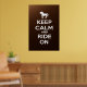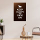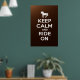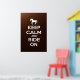 Mantenga la calma y siga el camino sobre el producto con texto de color blanco y fondo oscuro. Una variación de Mantener la calma y continuar