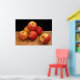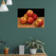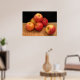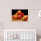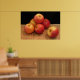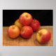 Este poster presenta una composición de vida muy simple, de seis hermosas manzanas rojas y amarillas brillantes sobre una alfombra de paja con un fondo negro.