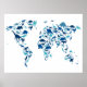 Un mapa del mundo hecho con siluetas de dinosaurios en tonos azules sobre fondo blanco