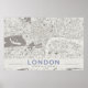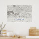 Mapa de tres colores ilustrado de Londres con texto púrpura, longitud y latitud en la lista