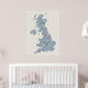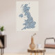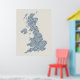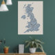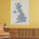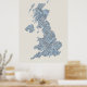 Mapa de texto tipográfico de Gran Bretaña que muestra más de 500 ciudades y pueblos dentro del Reino Unido, tonos azules sobre un fondo de marfil blanco roto.