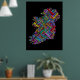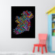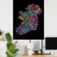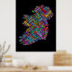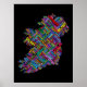 Mapa de texto de tipografía de Irlanda con más de 590 ciudades y pueblos dentro de Irlanda. Texto multicolor sobre fondo negro.