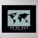Un mapa gráfico del mundo con un marco negro y el texto inspirador: 'somos uno, no importa dónde estés'