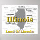 Imagen del orgullo del estado de Illinois incluyendo silueta de mapas con ciudades, pueblos y apodo.
