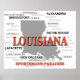 Imagen del orgullo del estado de Luisiana que incluye silueta de mapas con ciudades, pueblos y apodo.