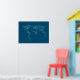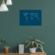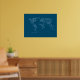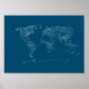 Este diseño muestra un mapa del mundo con grandes ríos, lagos y líneas costeras dibujadas en un color azul y un fondo oscuro usando la proyección del mapa robinson.