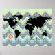 Mapa negro del mundo sobre un fondo rayado de gran chevron con un rosa de brújula y anclas pequeñas