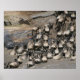 Wildebeest cruzando el río Mara en su migración anual de Kenia a Tanzania. Poster de personalizable completo disponible en una variedad de tamaños y tipos de papel. Los silvestres son famosos por su migración anual de larga distancia, aparentemente programada para coincidir con el patrón anual de precipitación y crecimiento de la hierba. El momento de su migración en las estaciones lluviosa y seca puede variar considerablemente (en meses) de un año a otro. Al final de la temporada de lluvias (mayo o junio en África oriental), los ñúes migran a las zonas de estación seca en respuesta a la falta de agua superficial (potable). Cuando la temporada de lluvias comienza de nuevo (meses después), los animales se mueven rápidamente de vuelta a sus rangos de temporada húmeda.