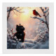 Un paisaje sereno de invierno con un gatito negro y un vibrante rojo ladrillo contra un fondo de follaje helado y copos de nieve suavemente caídos, evocando un sentido de magia y asombro en un estilo cinematográfico, épico que recuerda a cuadros clásicos de mate y al arte digital atmosférico.