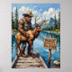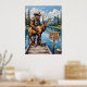 Esta imaginativa obra de arte retrata a Bigfoot, un gigante gentil en un gorra y chaleco de vaquero, parado en un pontón de madera junto a un tranquilo lago. Él lleva cuidadosamente una alce joven. El fondo está formado por árboles verdes y montañas brumosas bajo un cielo suave. Una señal de madera acristalada en el muelle declara alegremente, "BIGFOOT TAMPOCO CREE EN USTEDES". El grueso y expresivo cepillo crea una calidad de ensueño, destacando la naturaleza tierna y ligeramente surrealista de este momento a orillas del lago.