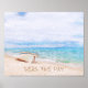 La tipografía "Mares el día" escribió una cita en la arena de esta fascinante escena de un barco pesquero con barcas en una playa de arena con acuarela azul océano y cielo soleado por encima.