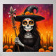 This poster features a vivid Día de los Muertos witch with a skull-painted face holds a staff amid glowing candles and marigolds, symbolizing remembrance and Mexican folklore. Finished in a mixed media art print.