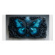 Una impresionante obra de arte de cerámica presentada como una escultura detallada, una intrincada baldosa de relieve o una exquisita forma de cerámica pintada. El tema central es una mariposa grande y mística con alas expansivas que brillan en el azul profundo, los negros y las telas luminosas. Sus patrones intrincados se definen con finas líneas incisionadas, esgraffito o técnicas de entrada de mishima, mientras que los cristales cristalinos, iridiscentes y translúcidos crean un llamativo resplandor bioluminiscente. El cuerpo esculpido se detalla con segmentación naturalista, trayendo una presencia real a la criatura. Alrededor de la mariposa, un bosque oscuro y encantador emerge en bajo relieve, con árboles y follaje representados en arcilla texturada y terminados con acristalamientos mate de azul profundo, gris y negro. La mezcla sutil de acristalamiento y las texturas superficiales evocan una atmósfera etérea y nebulosa, lo que aumenta la interacción dramática de luz y sombra. La obra es a la vez encantadora y profunda, una fusión magistral de detalles escultóricos, arte de cristal y profundidad narrativa.