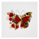 Mariposa de flores de los ojos de pavo real rojo con ala texturada roja, decorada con rosas rojos, pintados artistalmente con tallo dorado y hojas sobre fondo blanco.