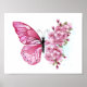 Arreglo floral de mariposa rosa con flores japonesas de cerezo rosadas sobre fondo blanco.