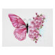 Arreglo floral de mariposa rosa con flores japonesas de cerezo rosadas sobre fondo blanco.