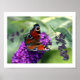 Una mariposa pavo real (Inachis io) se alimenta de flores de Buda morado en un jardín inglés.