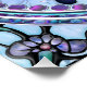 Una mariposa vibrante con tonos azules y violetas se centra en un diseño circular ornamentado, rodeado de intrincados motivos florales y joyas decorativas. La composición general se caracteriza por una estética de vidrio manchado con una mezcla armoniosa de colores y simetría.