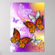 Naranja, mariposas monarcas detalladas sobre la luz, púrpura, pintoresco fondo pintado.