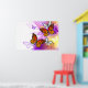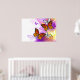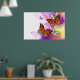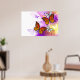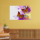 Naranja, mariposas monarcas detalladas sobre la luz, púrpura, pintoresco fondo pintado.