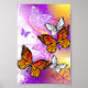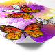Naranja, mariposas monarcas detalladas sobre la luz, púrpura, pintoresco fondo pintado.