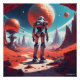 Un astronauta solitario se alza sobre un paisaje foráneo rocoso, contemplando una estructura robótica masiva con una cúpula clara y piernas mecánicas. En el cielo se ven múltiples planetas, lo que crea una sorprendente escena de exploración espacial.