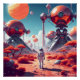 Un astronauta solitario se alza sobre un paisaje foráneo rocoso, contemplando una estructura robótica masiva con una cúpula clara y piernas mecánicas. En el cielo se ven múltiples planetas, lo que crea una sorprendente escena de exploración espacial.