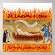 "Devuélveme", dijo a sus verdugos. "¡He terminado de este lado!" Conocido especialmente por su gran sentido del humor, San Lorenzo de Roma (siglo III) es uno de los mártires más celebrados de la Ciudad Eterna. Nos gusta pensar que nos divertiríamos con nuestros productos coordinados de "Grilling (o Cooking) with". + En este espléndido cuadro de c. 1430 del artista veneciano Jacobello del Fiore, San Lorenzo es retratado hasta la muerte. La disparidad en el tamaño de las figuras principales es una característica del arte que no emplea la perspectiva. Cuanto más grande es la figura, más importante es la persona que representa en la composición, Dios el Padre es una excepción aquí. San Lorenzo, tenso en el suelo, domina esta escena. Levantando su torso superior sobre sus codos y con las manos dobladas en la oración, el santo mira al cielo hacia Dios con una expresión serena en su rostro. Al igual que el personalizado en el arte pre-renacentista, Dios el Padre no está representado como una figura humana completa, sino como una cabeza que emerge de las nubes en la esquina superior izquierda de la imagen, donde solamente la Mano de Dios hubiera aparecido simbólicamente en años anteriores. A la derecha del panel, los verdugos de San Lorenzo, al lado en tamaño relativo e importancia para él, atienden el fuego debajo de la mugre con largos rastrillos, el que está delante protegiendo su cara del calor de las llamas. A la izquierda hay dos monjas arrodilladas, monjas que encargaron el panel como objeto de devoción privada o que encargaron el panel en nombre de su convento como parte de una obra de arte más grande como una predecesora. Son las cifras más pequeñas de todas. Los elementos secundarios incluyen dos deslizamientos con inscripciones latinas, uno en el espacio por encima del San Lorenzo y otro alrededor de las monjas. + San Lorenzo es santo patrón de comediantes y cocineros. + Festín: 10 de agosto + Crédito de la imagen (M 022): Martyrdom of Saint Lawrence, with Two Nuns, de Jacobello del Fiore (Venetian Italian; 1370-1439), pintura templada sobre paneles de madera de estilo gótico internacional, 27,7"x14,9" (70,5 cm) x 38 cm), Rijksmuseum, Amsterdam, Países Bajos, Acc. SK-A-4001. Las monjas han sido identificadas como dominicanas o benedicinas. De Wikimedia Commons {{PD-Art|PD-old-100}}. El archivo de imagen ha sido identificado como libre de restricciones conocidas bajo la ley de derechos de autor, incluyendo todos los derechos relacionados y vecinos. + Crédito de la imagen (borde de llama): Extensión/adaptación de imágenes prediseñadas (llamas de fuego digitales) de Diane Hudson, PublicDomainPictures.net, CC0 1.0 Universal (CC0 1.0) Dedicación de dominio público.