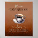 Este delicioso poster captura la esencia de encontrar alegría y energía en una simple taza de espresso. En su corazón se encuentra una taza de espresso bellamente ilustrada, descansando con gracia sobre su platillo. El espresso se representa con un detalle muy complejo, mostrando su profundo y rico matiz y la crema crema en su superficie. El mensaje "More ESPRESSO less DEPRESSO" (Más ESPRESSO menos DEPRESSO), puesto sobre un fondo marrón cálido y texturizado, llama la atención. "Más ESPRESSO" se escribe audazmente en un tipo de letra grande e invitante, mientras que "menos DEPRESSO" se graba dramáticamente en un estilo caprichoso y escrito a mano. En general, el poster irradia positividad y humor, sugiriendo que dejarse llevar por un poco más de expreso podría ser el remedio para esos momentos de sentirse deprimido o bajo. Es un recordatorio alegre para acoger los placeres simples de la vida y encontrar consuelo en el calor de una taza de espresso recién hecha.