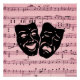 El talento artístico viene en muchas formas y cuando se une es espectacular. Las máscaras teatrales griegas de comedia y tragedia yacen sobre una hoja de música.