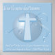 Poster cristiana con Mateo 6:34. Estén ansiosos por nada. Azul con cruz.