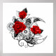 Contorno, luna de media luna mecánica con engranajes, decorada con rosas rojas con tallo negro y hojas sobre fondo blanco. Steampunk