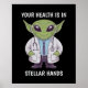 Trae un toque de cuidado extraterrestre a tu espacio con este poster con un médico alienígena amigable con uniforme profesional. Con un estetoscopio alrededor de su cuello, este profesional sanitario alienígena está listo para cuidar su bienestar. El lúgubre texto "Tu salud está en manos estelares" añade un toque divertido y cósmico a tu decoración de casa o de oficina. Perfecto para los amantes de la ciencia ficción, los aficionados a la medicina o cualquier persona que ame un diseño único y fuera de este mundo.