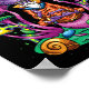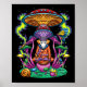 La imagen representa una escena psicodélica con una figura central de un hombre de aspecto inteligente meditando en una posición de loto. Está rodeado por una vibrante variedad de hongos coloridos, incluyendo uno grande en forma de paraguas que se eleva sobre él. Flamas de varios colores bailan alrededor de las setas, creando un ambiente místico y de otra índole.