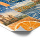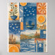 Bring warmth, texture, and timeless charm to your space with this stunning Mediterranean-inspired collage artwork. Designed in a rich palette of deep ocean blues and vibrant citrus oranges, this vintage-style composition blends coastal waves, soaring birds, architectural silhouettes, botanical elements, and detailed orange slices into a harmonious artistic grid.