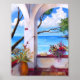 This is a view of the ocean with clouds and sailboats viewed from a whitewashed balcony. There are flowers, trees and a cat. Warm, vibrant colors.