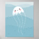Póster Medusa kawaii linda nadando en olas azules suaves
