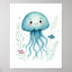 Una encantadora ilustración que presenta una medusa azul rodeada de peces amistosos y delicada vegetación. Esta obra de arte es perfecta para agregar un toque de magia submarina a cualquier espacio