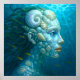 Umgeben ist sie von schimmernden goldenen Fischen, die dem Bild Bewegung und Lebendigkeit verleihen.