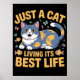 Este gráfico adorable presenta un gato personalizado de varios colores con parches azul-gris, blanco y naranja, felizmente tumbado con ojos anchos y serenos. Alrededor del gato, pequeños peces amarillos y mariposas se suman a la escena idílica. El texto audaz y naranja proclama, "SÓLO UN GATO QUE VIVE SU MEJOR VIDA", encapsulando perfectamente la esencia despreocupada de la independencia felina. El diseño está puesto sobre un fondo negro sólido. Descarga digital sólo para uso personal.