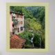 Esta es una imagen de baja resolución para la web, la impresión que obtendrás tiene un detalle agudo. Viviendas de montaña construidas frente a los acantilados, cascadas que fluyen en el lago de Como. Aldea de Menaggio, Italia. Fotografía de Minerva Bloom.