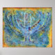 La obra de arte original de esta menorah es una pintura de medios mixtos creada con pintura acrílica, pasta de modelado y papel de la artista judía contemporánea Meredith Gould.